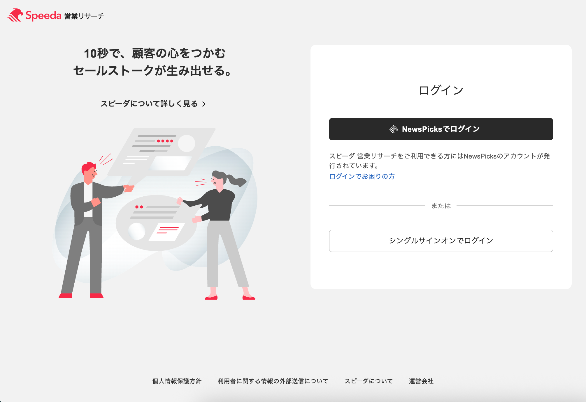 スピーダ 営業リサーチへは、NewsPicks ID もしくはシングルサインオンにてログインを行います。