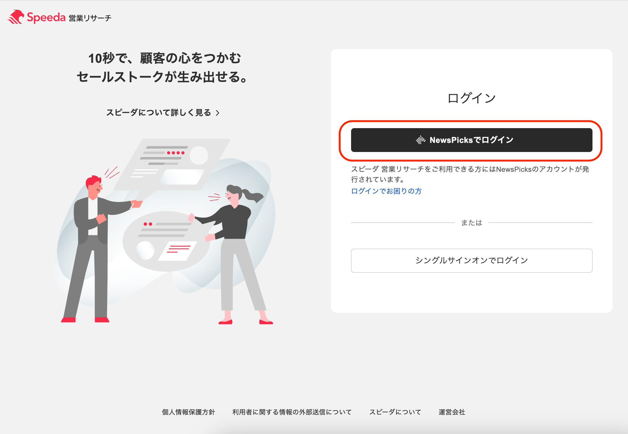 - スピーダ 営業リサーチへのログインURL(https://forcas-sales.ub-speeda.com/signin)へ再度アクセスし、画面に表示された「NewsPicksでログイン」でログイン