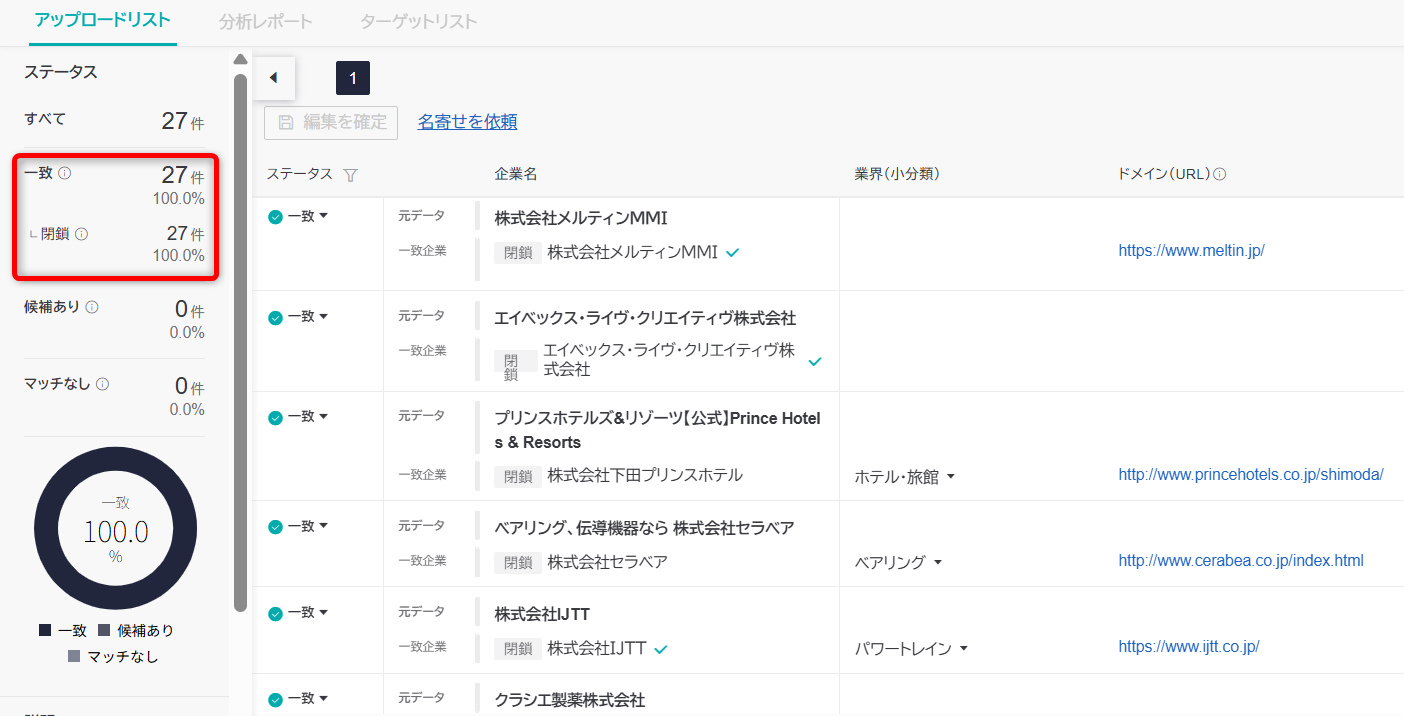 分析モデルは存続している一致企業レコードのみを対象となります。