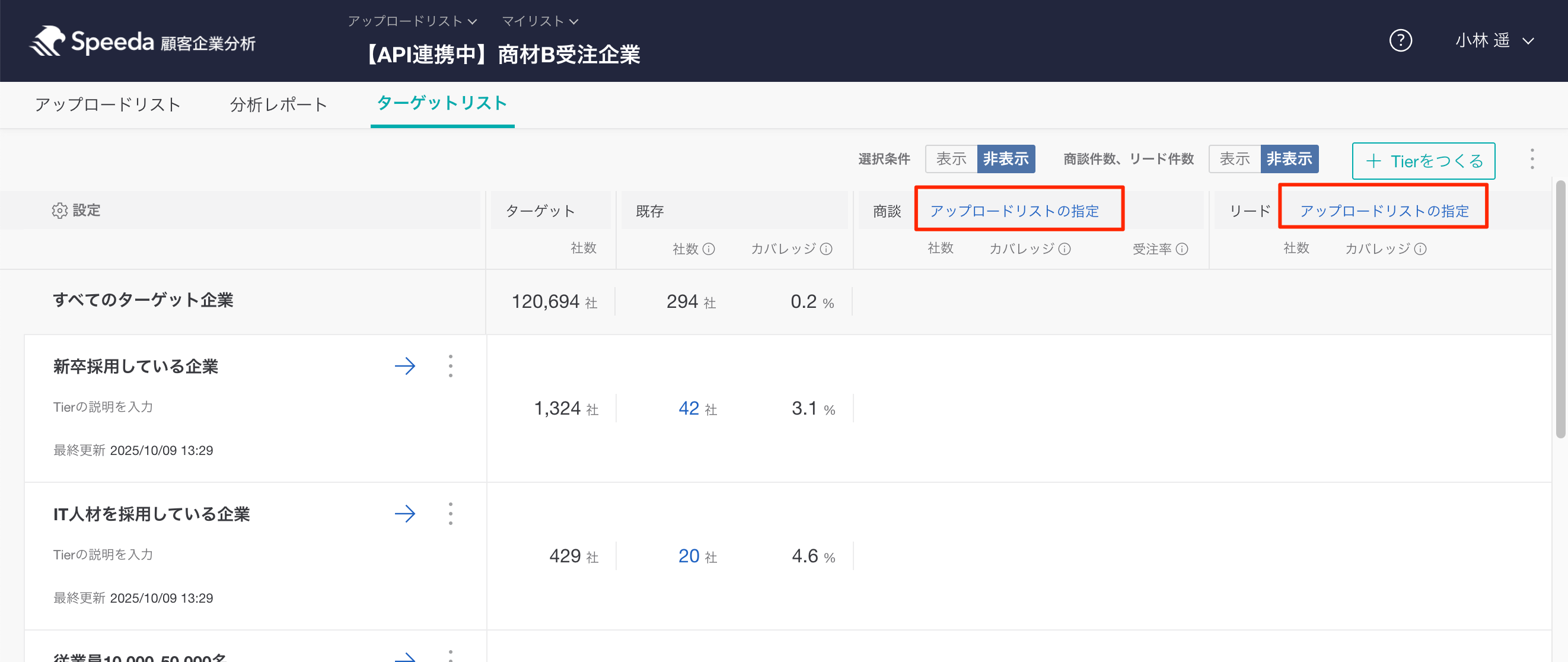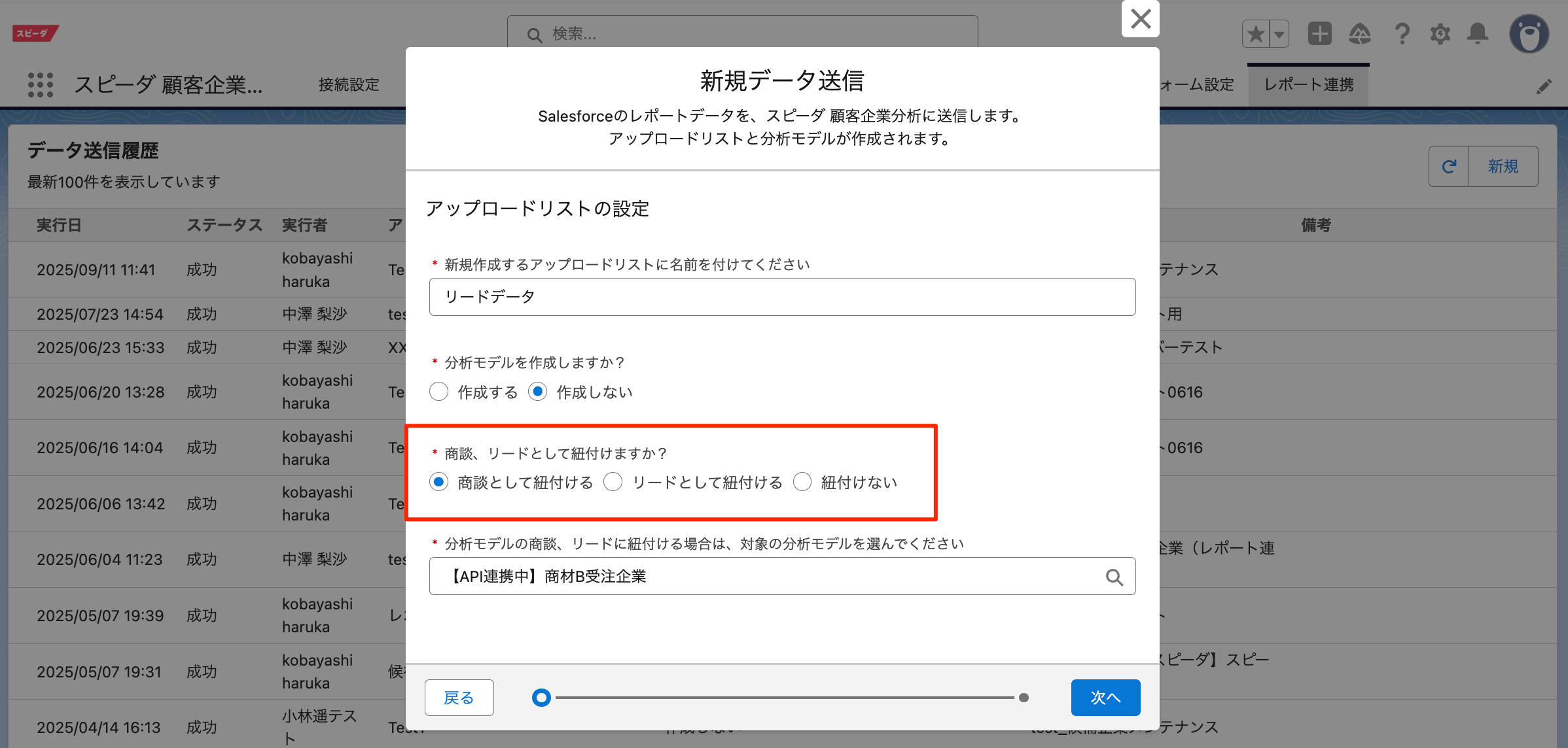 にて新規レポート連携を行う際に、「商談、リードとして紐付けますか?」という選択肢があります。こちらはスピーダ 顧客企業分析のターゲットリスト一覧画面の「顧客分析ダッシュボード」で商談やリードの受注率やカバレッジを確認するために必要な選択肢になります。