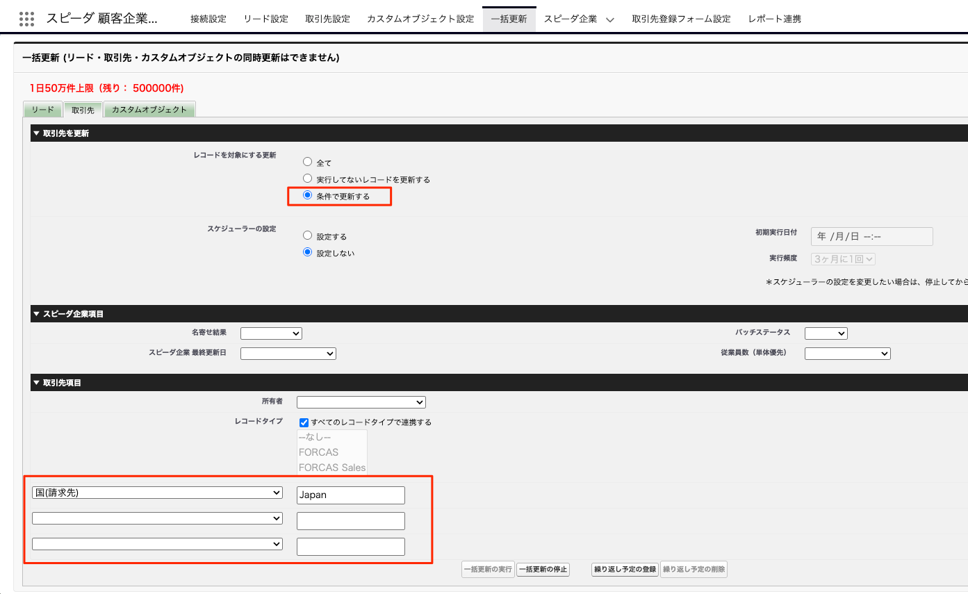- 一括更新の条件指定では、弊社よりご用意している条件に加え、お好きな項目を3つまで選択いただくことが可能です。複数条件選択時の項目間条件はすべてアンド(&)条件となります