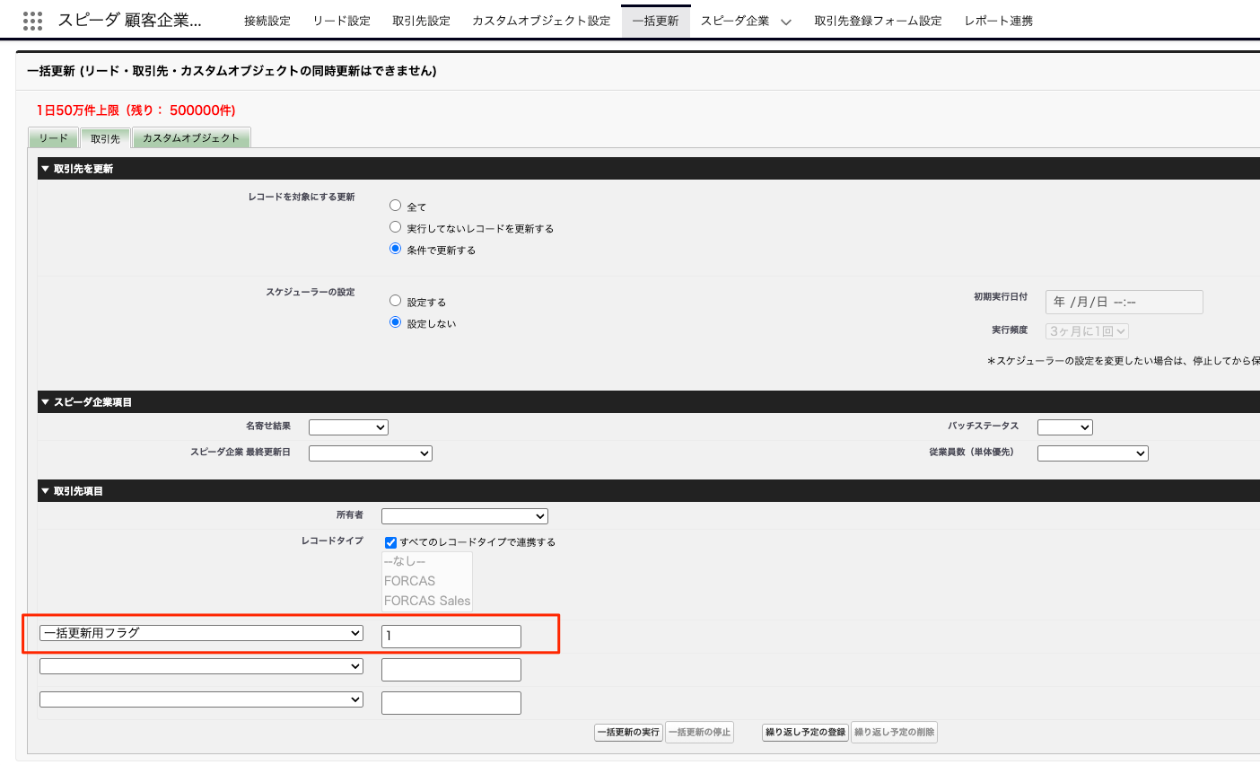 1:別のテキスト型のカスタム項目(例:一括更新用フラグ)を作成する