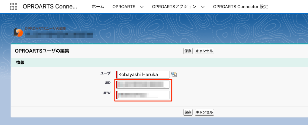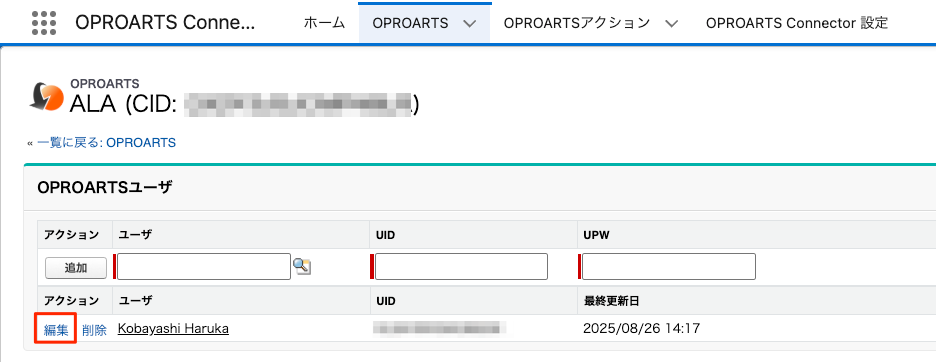 - Salesforce >OPROARTS Connector v2 > [OPROARTS]タブ>[全ユーザ出力 (ALA) ] をクリック>ユーザの左横[編集]ボタンをクリックし、中のUID/UPWを確認