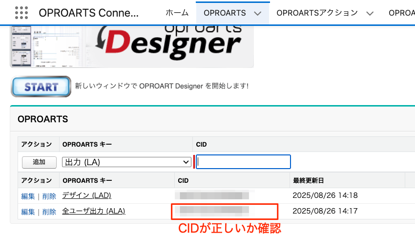 - Salesforce >OPROARTS Connector v2 > [OPROARTS]タブ>[全ユーザ出力 (ALA) ] のCIDを確認