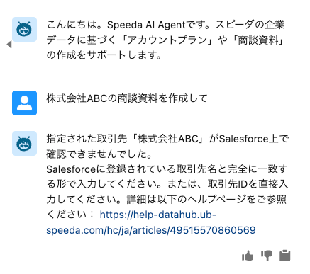 Speeda AI Agent for Agentforceでアカウントプラン作成/商談資料出力時、取引先名が重複するレコードが存在する等の理由により対象企業を特定できない場合、スピーダ用エージェントより取引先IDをお伺いします。