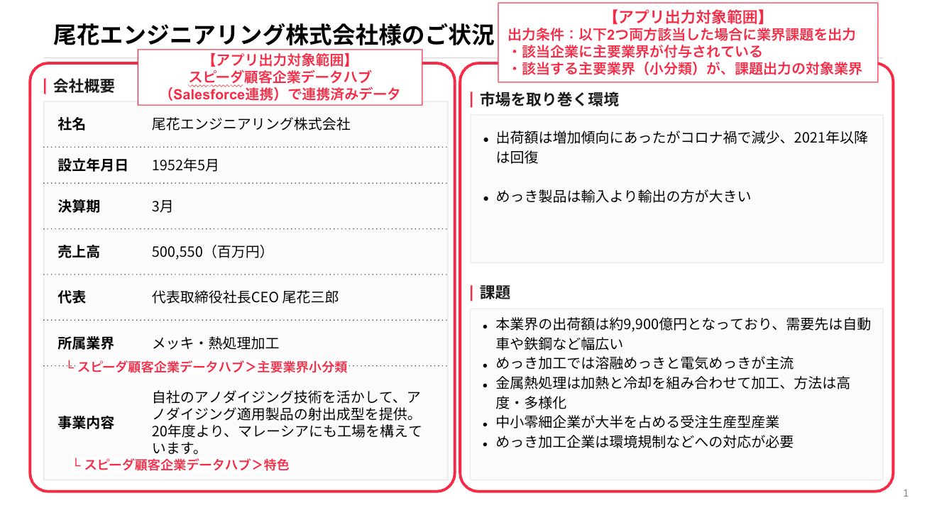 - 出力条件:スピーダ 顧客企業データハブで連携されているデータ