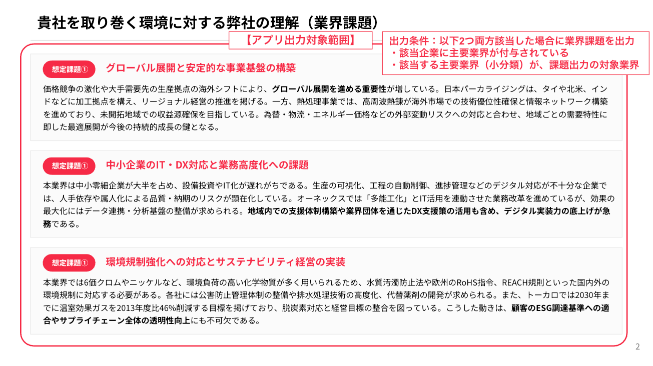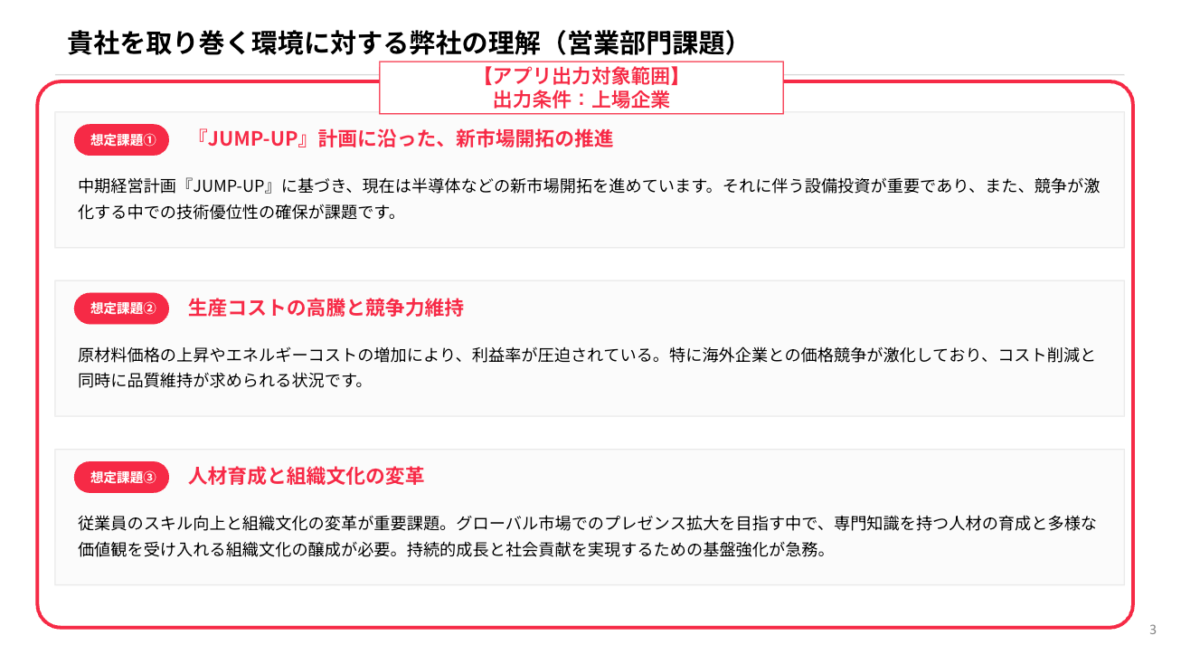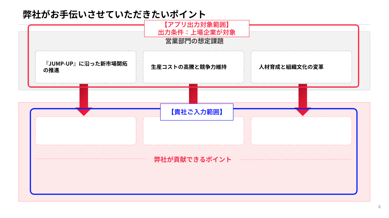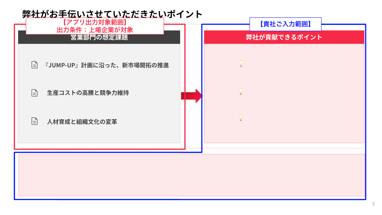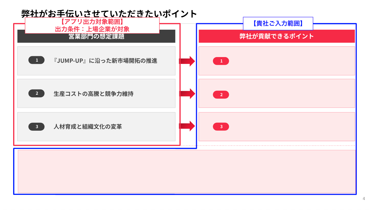 - 出力された企業課題に対し、貴社が貢献できる訴求ポイントの記載