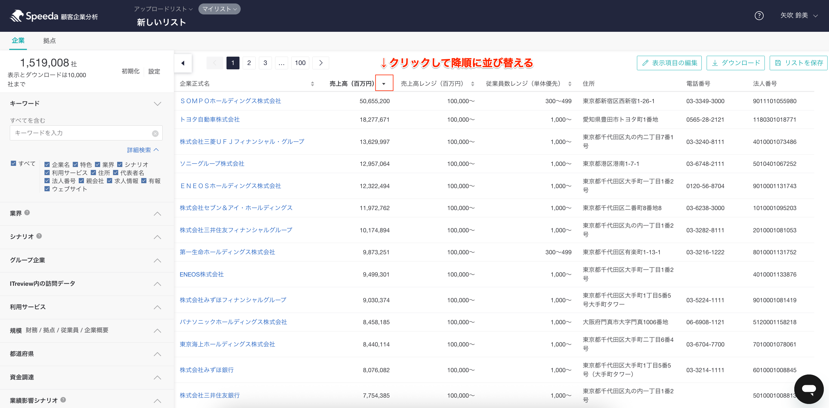 マイリストにて、表示項目の編集から売上高を表示 > 矢印マークをクリックして降順に並び替えると、売上高が高い順に表示されます。