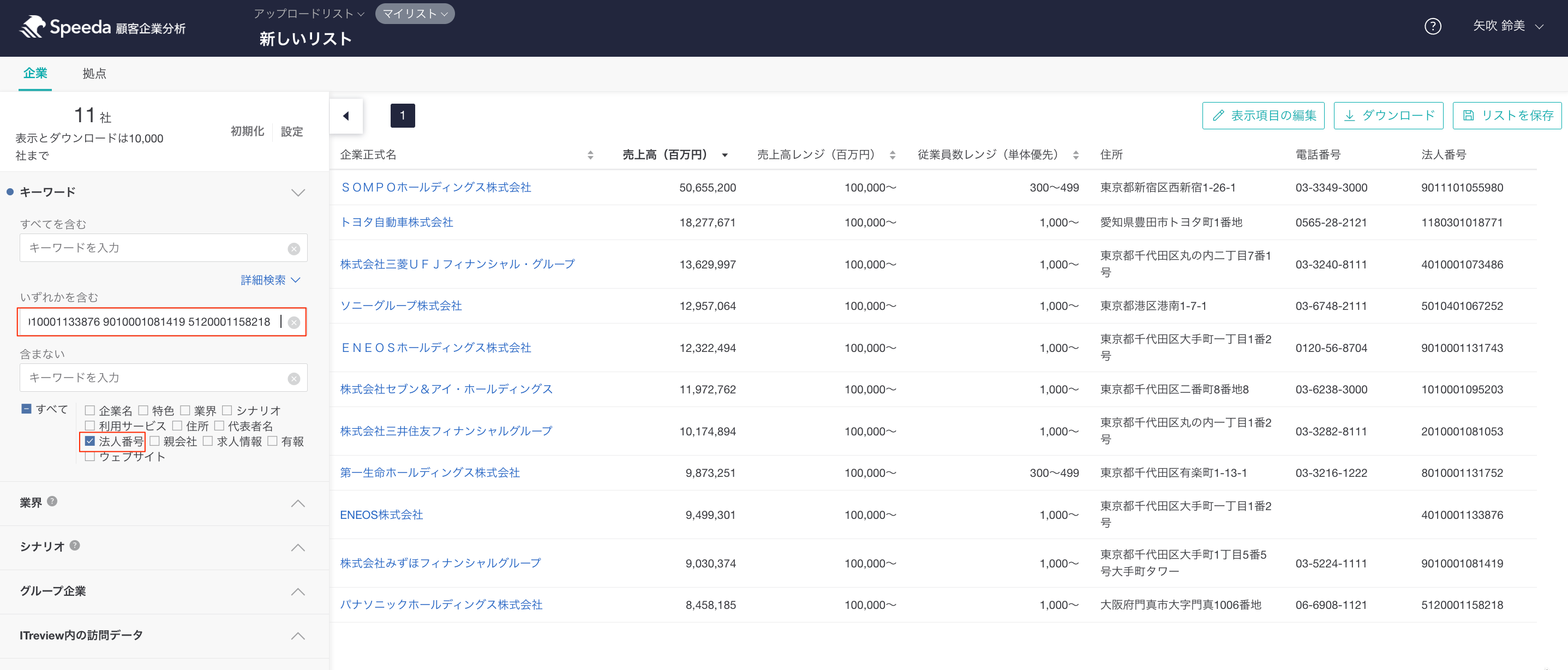 売上高が高い順に企業の法人番号を控えていただき、キーワード検索で「法人番号」を指定 > 入力することで、リストにすることが可能です。