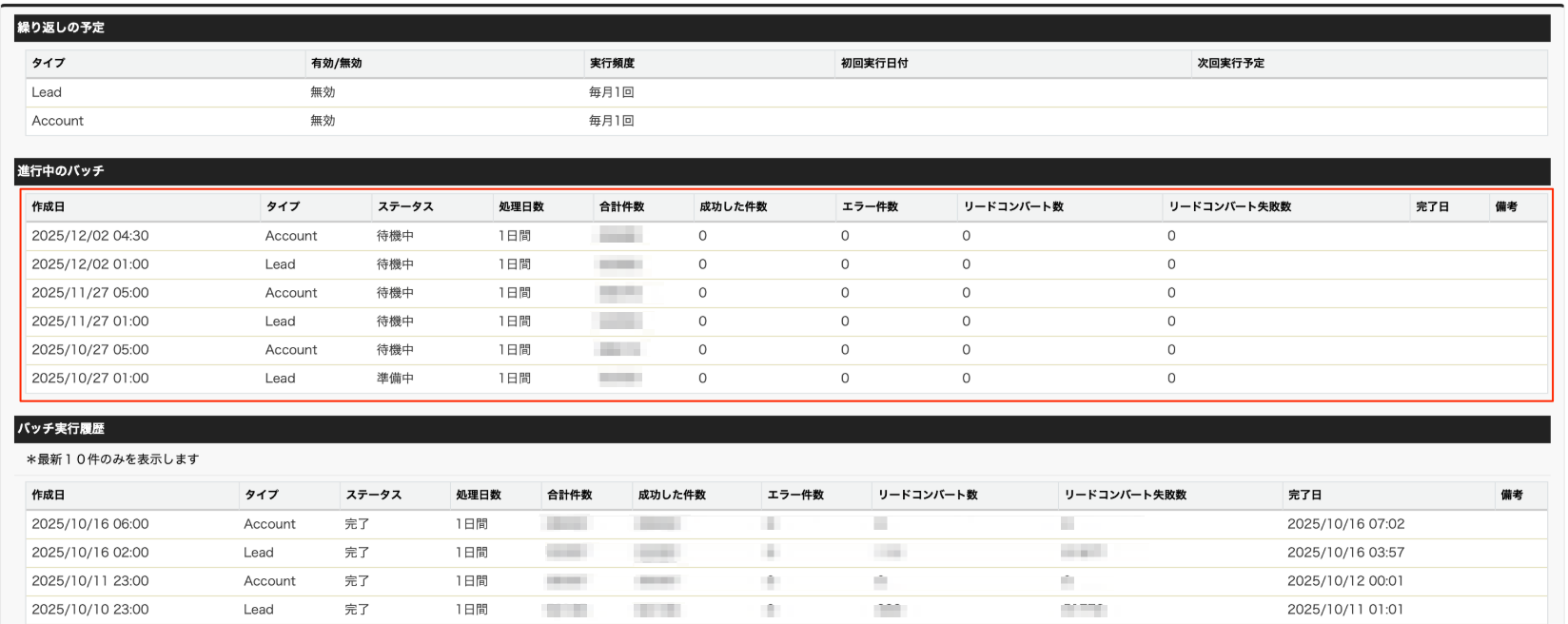 ※本ページ上部の画面キャプチャを例にあげると、取引先で3回、リードで3回一括更新の停止を実施します。