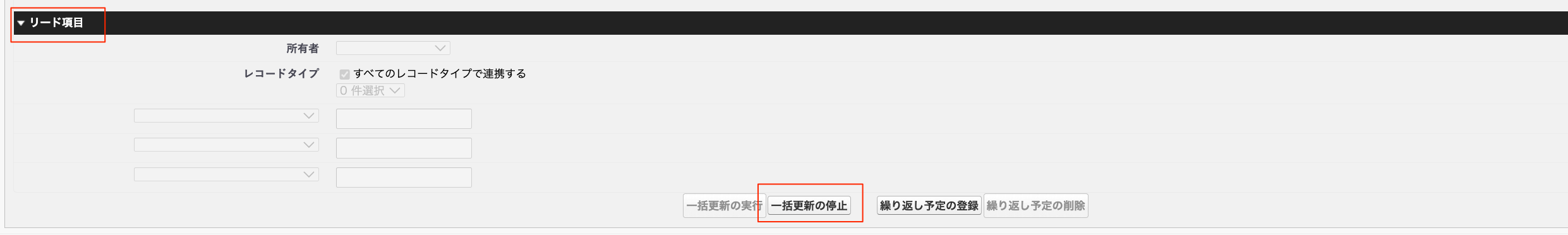 1.リード・取引先それぞれ進行中のバッチ一覧に表示されている回数分「一括更新の停止」を押下する