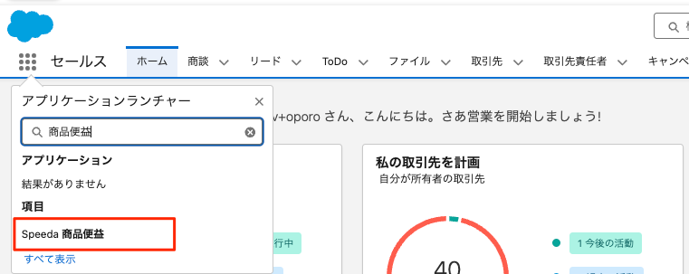 - Salesforceアプリケーションランチャーから「Speeda 商品便益」を開く