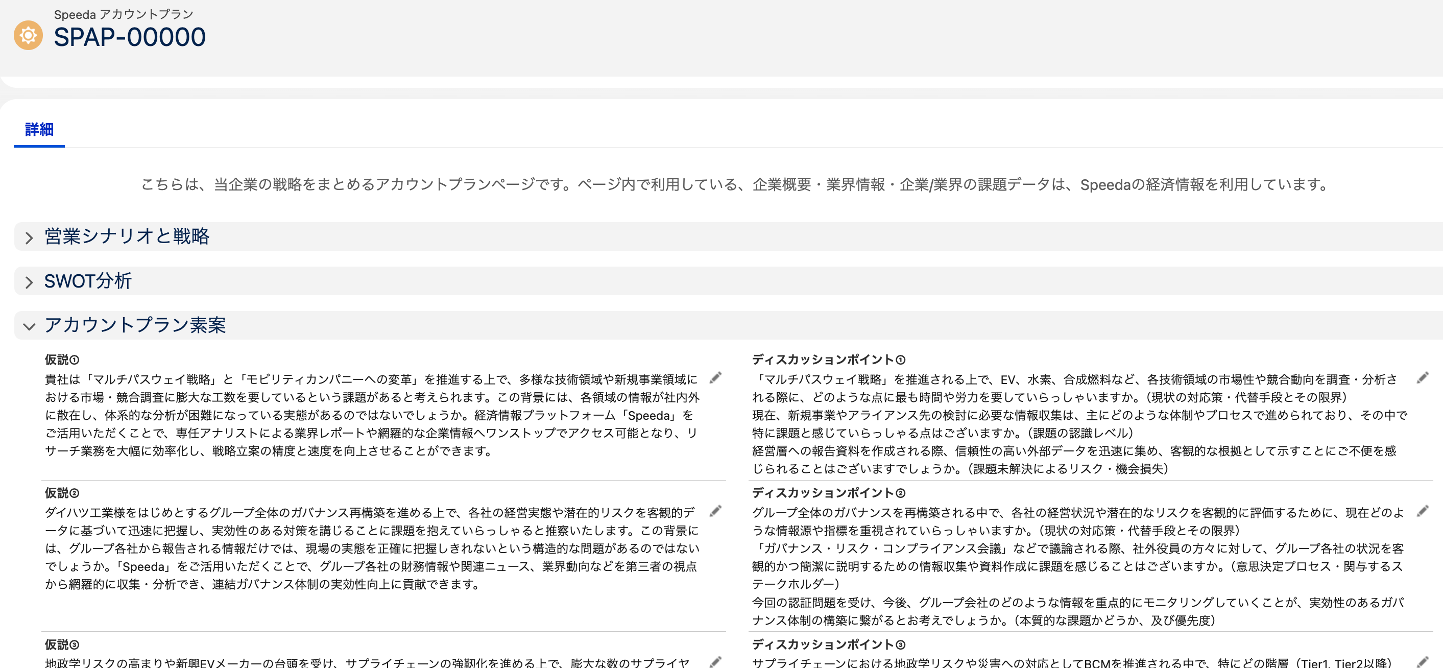 Speeda アカウントプランの仮説やディスカッションポイントは、ここで登録された商品便益の内容をもとにAgentforceのLLMがSpeedaのデータをかけ合わせたアウトプットを作成します。
