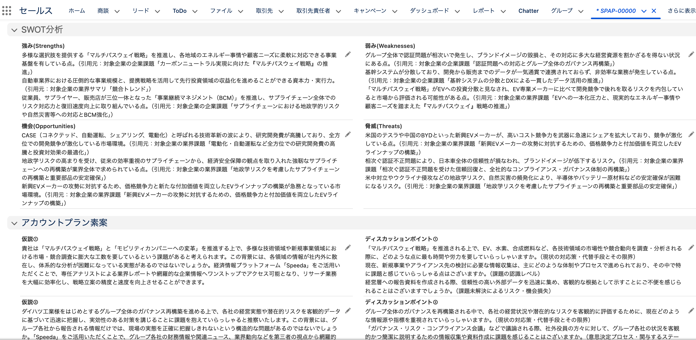 - SalesforceにインポートしたSpeeda 企業課題 / Speeda 業界課題 / Speeda 業界サマリーの内容を基に、LLMで生成&アウトプット