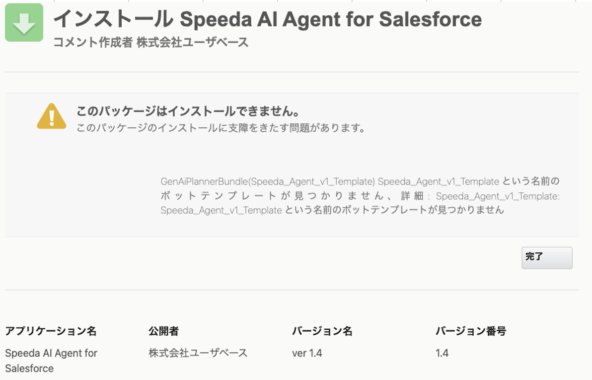 Speeda AI Agent for Salesforceのアプリインストール時に以下のエラーでインストールができない場合、Employee Agentを利用するためのライセンスが必要です。