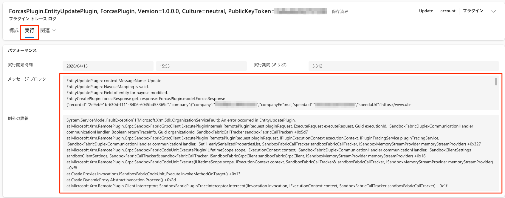 A. スピーダの情報が何も表示されない(= [名寄せ結果] の値も空欄)の場合、何かしらの原因でうまく連携が実行されていない可能性がございます。そのようなレコードが存在する場合、以下のステップに沿って該当レコードの作成or更新時間のプラグイン トレース ログをご提供ください。