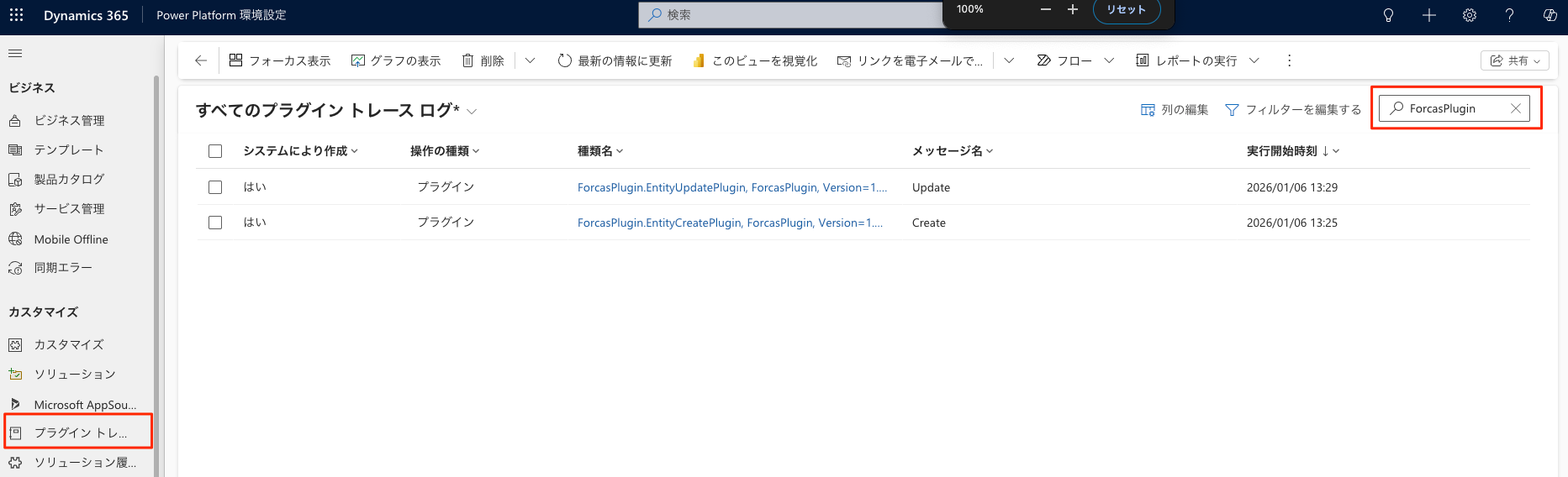 - プラグイン トレース ログの一覧に、名前のタイプやメッセージ名に基づくエントリが表示